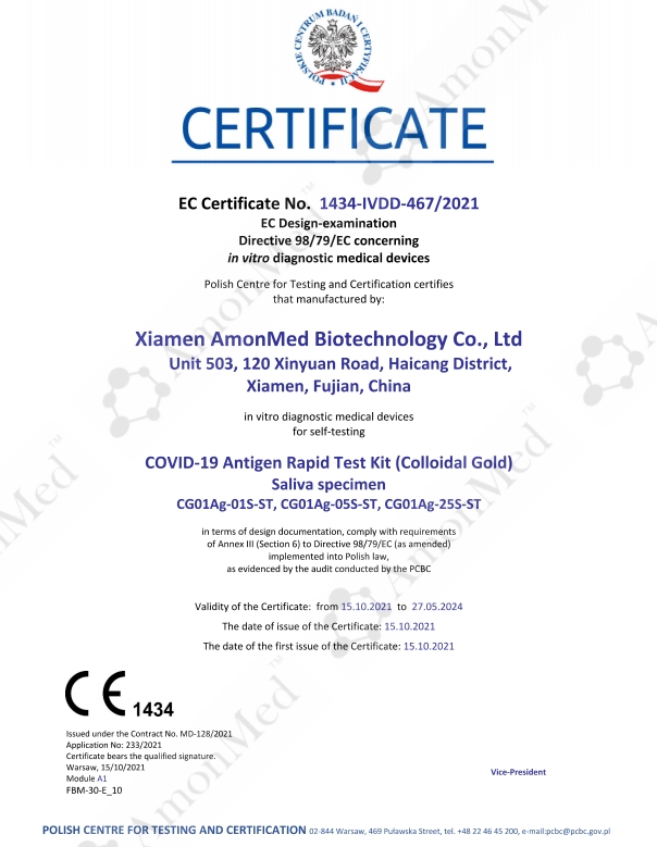 2021年10月15號,波蘭PCBC機構(gòu)國際公告(公告號1434),正式頒布奧德生物新型冠狀病毒抗原快速檢測試劑盒 (膠體金法)唾液拭子歐盟自測CE認證證書。奧德CE證書是按照歐盟8月份頒布的新法規(guī)準備的技術(shù)文件。